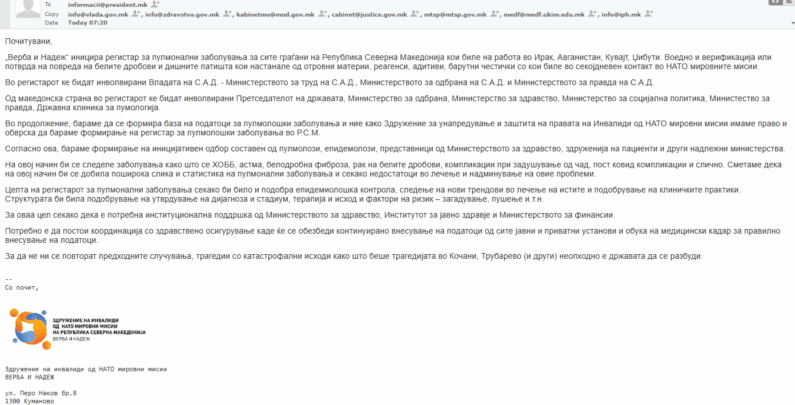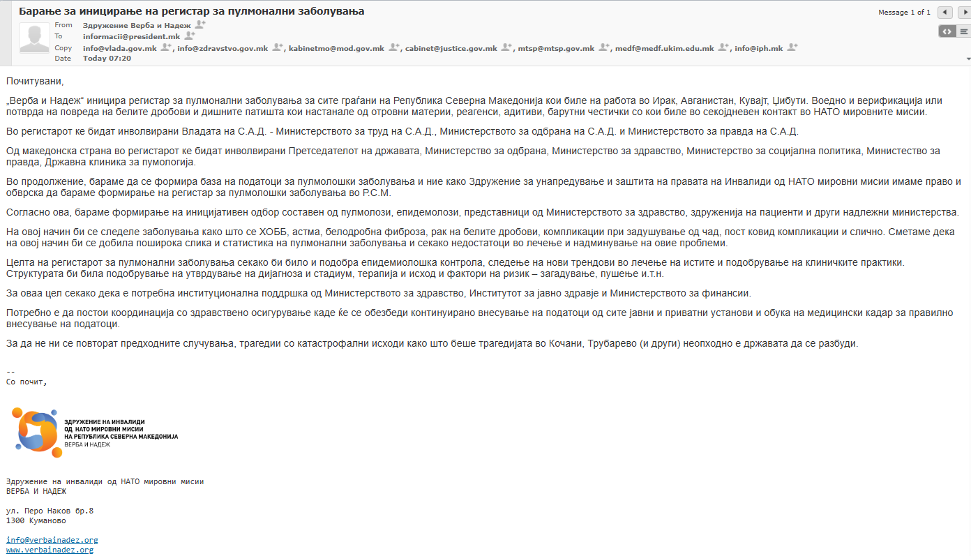 Во продолжение, бараме да се формира база на податоци за пулмолошки заболувања и ние како Здружение за унапредување и заштита на правата на Инвалиди од НАТО мировни мисии имаме право и обврска да бараме формирање на регистар за пулмолошки заболувања во Р.С.М.